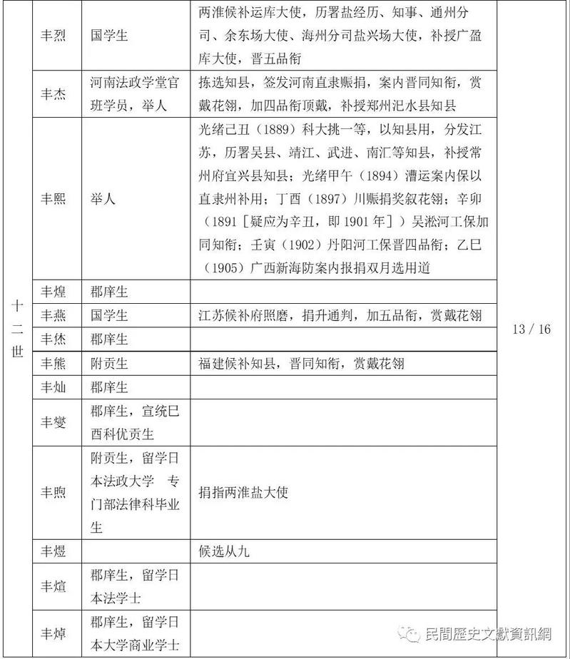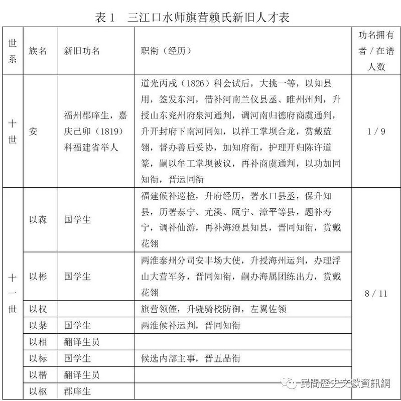 赖氏的例子比许氏更加典型。生活于乾隆至道光年间担任领催的赖通照,因人口繁滋而“家素贫”,甚至到了“饔飧不给”的地步,尽管如此,他却尽力“维持家计”,命其子赖安“无预”生计,“专意读书”。在这种条件下努力读书和参加科考的赖安,对生活的困顿有深切的体验,一度打算“弃文就武”,欲“就挑领催,得俸薪以纾父困”。他甚至在考中生员、举人后,“习骑射……仍不辍问”。时任福州将军的萨炳阿“闻而嘉之,不令与挑,而筹款助试。”赖家由此幸免于“弃文就武”,并形成良好的读书应举传统。赖安之侄赖以森,“课子读书甚严,或延名师于家,或命负笈于省,望熊( 赖丰熊) 等成名固甚切。”赖以森经常勉励子侄“读书立志,克绍书香”。赖氏由此成为水师营著名的科举世家,“( 赖) 安大骋骥足,而( 赖) 骞子以森、以权亦接踵贵显至封翁,曾、元辈服官不下十余人。”至晚清兴办新式学堂,提倡留学教育,赖家子弟又积极抓住机会,热心参与新式教育,甚至远赴东洋留学。这样,到清末民初之际,赖氏家族可谓人才济济,不仅旧式功名获得者人数众多,各种新式“毕业生”、“肄业生”或“留学生”也不在少数,其中颇不乏既拥有旧功名又拥有新学衔的“过渡性人才”。为直观说明起见,兹据《福州洋屿颍川赖氏家谱》,将水师营赖氏“大宗”的新旧科举教育人才罗列于表1。
