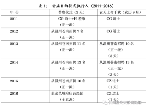 寺庙建成以前,这个社区在中元节的时候,举行“庆赞中元”的活动,即“拜好兄弟”。寺庙建成之后,2011年从台湾邀请道士进行仪式,翌年又从浙江省温州市苍南请来道士主持仪礼。下表总结了2011年以来仪式执行人的名单。另外作为参考,本表也包括了在该寺庙搭建的临时帐篷内所举行的大规模的仪式。