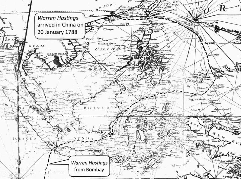 18世纪50年代,英国的船长们也开始探索能让他们穿越香料群岛和菲律宾群岛东部的航线。地图2展示了英国东印度公司的Warren Hastings号在1787-1788年间所采用的航线。这条航线比那些穿过南中国海的航线要长很多,但可以让船舶绕开季风在任何时候抵达中国。