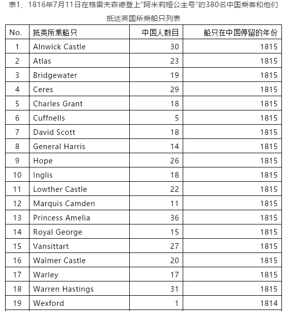 1816年运载着380名中国水手到达英国的19艘船里,有18艘曾在1815年到过中国。其中一艘名叫Wexford号的船曾在1814年到过中国,但是直到1815年夏季才回到英国。像“阿米莉娅公主号”的事例所表明的,大多数中国水手都是在中国上的船。