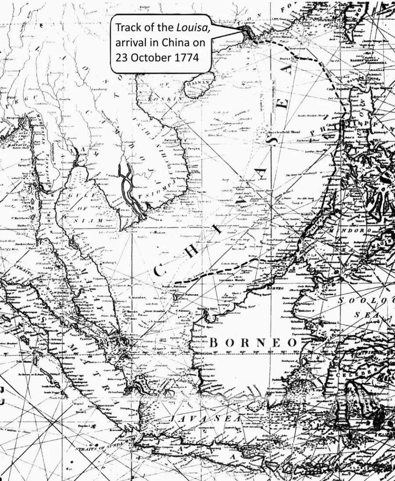 图1,1774年英国私人船只“路易莎号”从马来西亚到中国的航海图