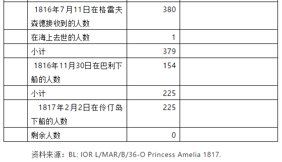 1815年12月6日,“阿米莉娅公主号”满载货物并开始顺流而下经过虎门。12月8日在澳门外面的莱德隆群岛下锚时,这艘船秘密地搭载了36名中国水手。这些人于1816年5月14日在布莱克沃尔登陆。他们获得了在船上工作5个月零6天的工资。1816年6月15日,这36名中国水手再次登上了“阿米莉娅公主号”,只不过这次是作为乘客。期间他们在格林威治港内的生活都由所在船只负责维持。他们是表1所示380名中国乘客中的一部分。其余344名于7月14日登船。这36名水手的薪资记录在这艘船1815年到1816年的支付账单上,而所有380人的姓氏(没有名字)都可以在航行日志中找到。