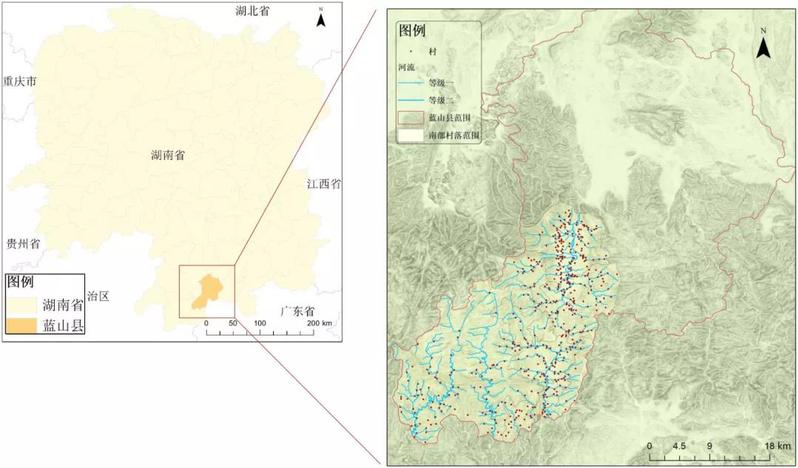 宋代蓝山隶属桂阳军,元朝时改属桂阳路。明初隶属郴州,后改属衡州府桂阳州。1732年,桂阳州升为直隶州,领蓝山县。1915年,因废州府厅,蓝山县直隶于湖南省。1949年12月,蓝山县成立县人民政府,属郴县专员公署,1952年属湘南行署,1954年属郴县专署,1961年属郴州专署。1962年12月改隶零陵专署,1995年撤销零陵地区,建立永州地级市,蓝山县遂隶属永州。本文以蓝山县南部山地的400多个村落(图1)为研究范围(这一区域是18世纪至20世纪蓝山县下辖五个乡中的“舜乡”)。