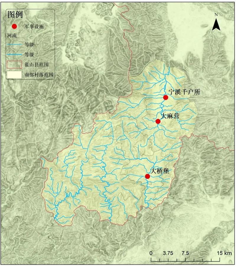 明王朝军事系统的卫所一般以若干个府级行政区设立一个防区,称作卫,卫以下设千户所、百户所。根据明代初期的制度,以5600人为卫,1200人为千户所,120人为百户所,卫所的兵士被编为军户,世袭当兵。明永乐年间,卫所的数目达到最高峰,全国共设置了493个卫,359个千户所。明初设立卫所,亦相应创设了军屯体制。一般而言,卫所军士有三分守城七分屯种或二分守城八分屯种之制。根据地方的具体情况,通常每个军士可分到20亩至100亩土地进行耕种,并缴纳一定赋税,但无须像民户一样承担徭役。后来,随军家属也可顶替军士耕种屯田。湘南地区在明代前期总共设置了4个卫,10个千户所,其中就包括了蓝山境内设于1396年的宁溪千户所。该千户所筑有所城一座,所城南面水陆要冲之地设置了大麻营军营和大桥堡城堡(见图2)。这些军事卫所、军营和城堡的设置,除了防御南部山区的叛乱者入侵之外,也相应促进了该地区卫所屯田的发展。