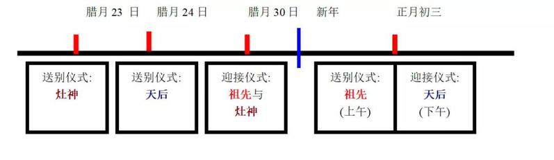 腊月二十四日,恭送天后回天仪式、春节初三晚上恭请天后回宫的典礼,与越南人关于厨神和祖先供奉仪式的风俗类似。新年正好是家庭团圆的时间,团圆的动作在世俗世界与神灵世界同时进行。在通常情况下,越南人会在腊月二十三日早晨举行告别灶君的仪式,腊月三十日上午又隆重地恭请灶君与祖先回家。祖先与灶君回家过节代表着家庭团圆与幸福。祖先在家里过节之后,于正月初三上午就被子孙通过年初仪式送走。至于天后圣母,金瓯市华人在腊月二十四日举行告别仪式,然后正月初三晚上又迎接她回来。说明当地华人把天后信念及供奉意识与灶君和祖先仪式等同起来,为何时间安排还有差距呢?