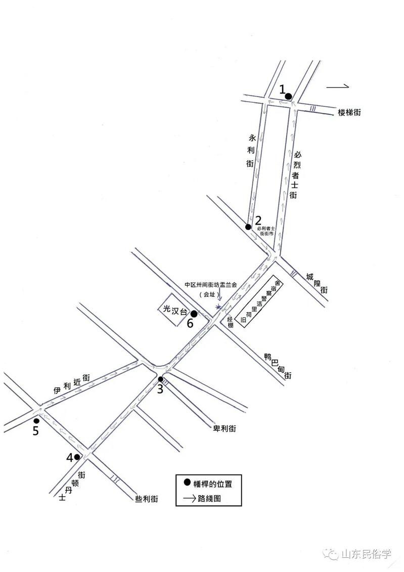 锣鼓和醮司带领九位身穿红色道袍的经生、法会的总理和工作人员,列队由经棚出发,进行朝幡的仪式。幡杆用一根长长的竹竿撑起,上面挂着六个灯笼,灯笼顺序写着“中元二品赦罪地官清虚大帝”,幡杆下面供奉着一个幡亭,幡亭内写着一个“神”字。幡杆灯笼主要用以招引孤魂野鬼,进入法场享受祭品。高功逐一为各幡杆开光、诵经。最后,总理敬奉茶酒及烧香化宝,再由经生领总理和值理行叩拜礼。幡杆的位置划定了整个卅间盂兰会的祭祀空间,经由经生一系列的仪式,达到“合境平安”的目的。(朝幡的路线,详见图2)
