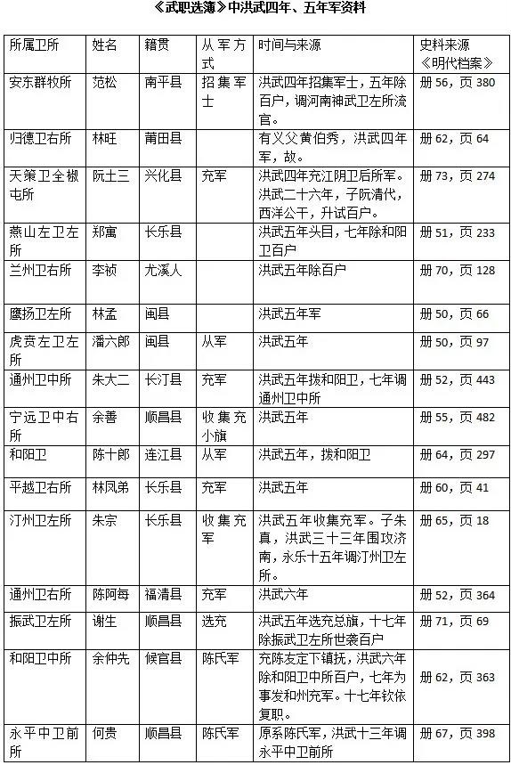 根据这一记载,元代降将阮德柔于洪武四年到建宁招集元军旧部,因激怒了原来该地区的军户而被杀。又有“洪武五年九月己酉,故元降将行枢密院同佥赖正孙招集福州遗兵五千人送京师。又是一起福建地区的故元将领招集故元旧军的记录,而洪武六年三月,更有进一步的说明:“先是,正孙牧集陈友定旧将士八千人,诏以补和阳卫军伍。”从选簿资料来看,从长汀、顺昌、侯官到长乐、福清、连江,闽西至闽东,都有原来陈友定的旧军,在赖正孙的这一次收集中被调拨组建和阳卫,洪武五年的记载是“福州遗兵五千人”,而洪武六年中指明“陈友定旧将士八千人”,可见还有其他不属于福州地区的陈友定旧军被其收集进入了明代的卫所系统。