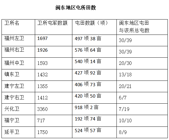 正如前文所述,明代在福建的军事建制主要分为福建都指挥使司和福建行都指挥使司。福建的两个都司共辖98个千户所,每个卫所都有军屯。据何乔远《闽书》的记载: