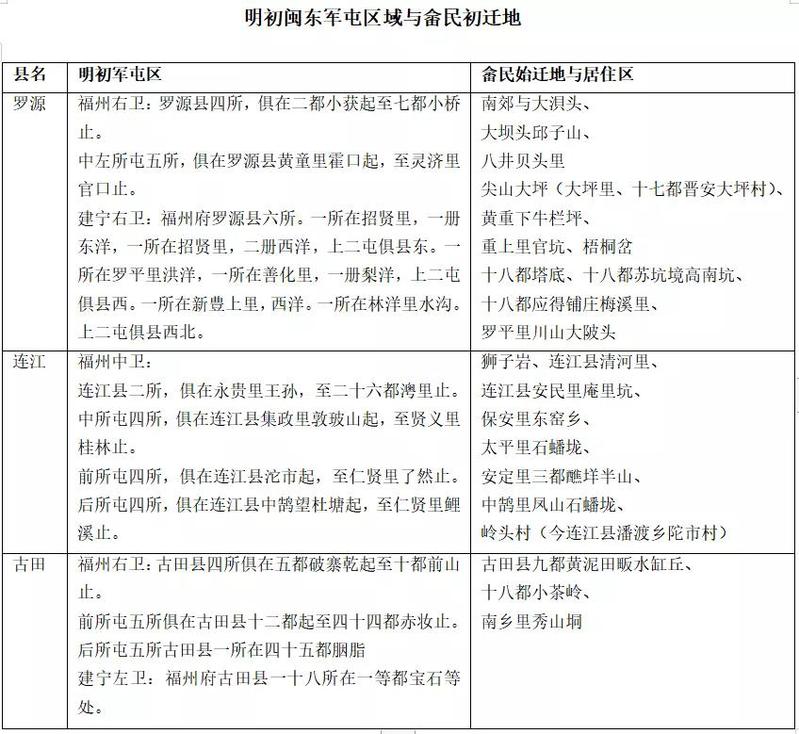同书中还收有明嘉靖年间福宁人周璞所作的《修城记》,更详尽的追溯福宁卫建立之初的情景:州自为县时未城,城之者,洪武辛亥(1371)筑垣周三里。庚申(洪武十三年)置卫,人众城小,乃拓东城一里,独郭西民尚置城外,数厄寇患。周璞本身即是福宁人,所记自然可信度更高,由此可证畲民族谱中有关洪武十三年在福宁州的记录是可信的。而当时所建的正是福宁卫的卫所城,可推知当时在福宁州地区的畲民很有可能是因和卫所、屯田有关的原因来到了闽东。进一步将二百余部畲民族谱中的明代初迁地地名进行统计,发现其高度集中于罗源、连江与古田地区,再将其与《八闽通志》中记载的明初这三个地区的军屯区域范围进行对比: