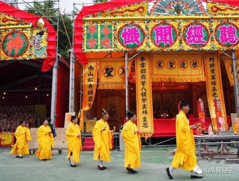 如广府民系会邀请俗称“喃呒先生”的正一派道士和全真教道堂的男女“经生”祭祀道教的诸神、诵唱道教经典以及举行破地狱、大放三清等道教的科仪。海丰陆丰县的“福佬”民系,主持福佬系道坛的道士则结合道教和佛教、并且执行杂技般的仪式。潮州系会请善堂或念佛社的在家的带发“经师”,来主持潮汕地区特有的、佛教色彩强烈的仪式。在佛教团体和先天道的道堂里,由“僧侣”“尼姑”“斎姑”以及信众们组成的诵经团吟诵佛教经典,举行“放燄口”等仪式。仪式空间的建立、宗教职能者身着的服装、仪式进行时的音乐,这三者在不同团体和地域中是截然不同的。