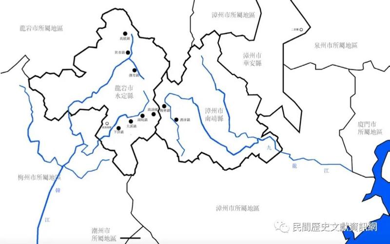 圖2土樓分布的主要鄉鎮,及其與行政區範圍及河流的關係。