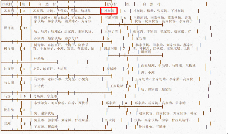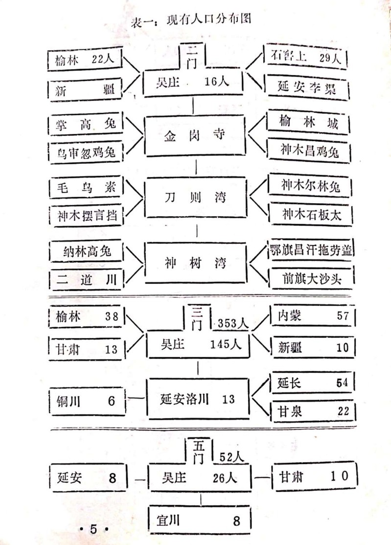 我家所在的村子叫神树湾村,属榆林市榆阳区孟家湾乡管辖,村里有4个大队,基本是按照居住方位来划分的,我们属于三队。队里的房屋看起来稀稀拉拉的,很难将其归为聚集性或是散居性,每家每户基本隔着2-3个沙丘,一队大概有10户人家左右。据家里仅存的1989年《吴氏家谱》记载,三百多年前,吴氏先祖——唐尔茂由绥德满堂川迁居榆林清泉吴庄,并改姓吴名天录,娶妻刘氏生子吴东山,吴东山生八子,此即后辈延称“八大门”之源头。[5]后二门中期大部迁居榆林以北,人口发展较快,应为现在村里的吴姓。
