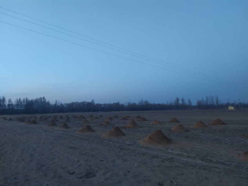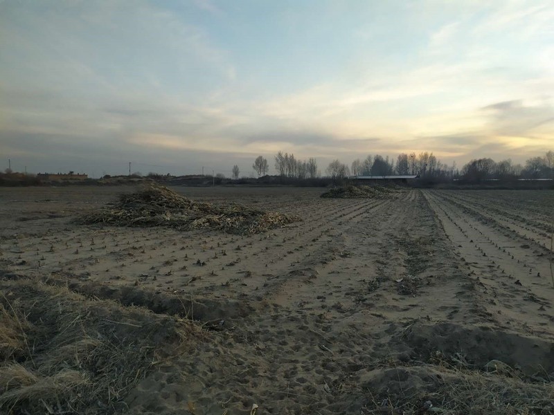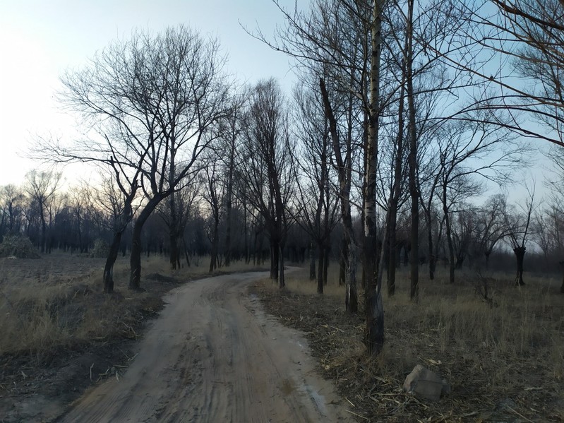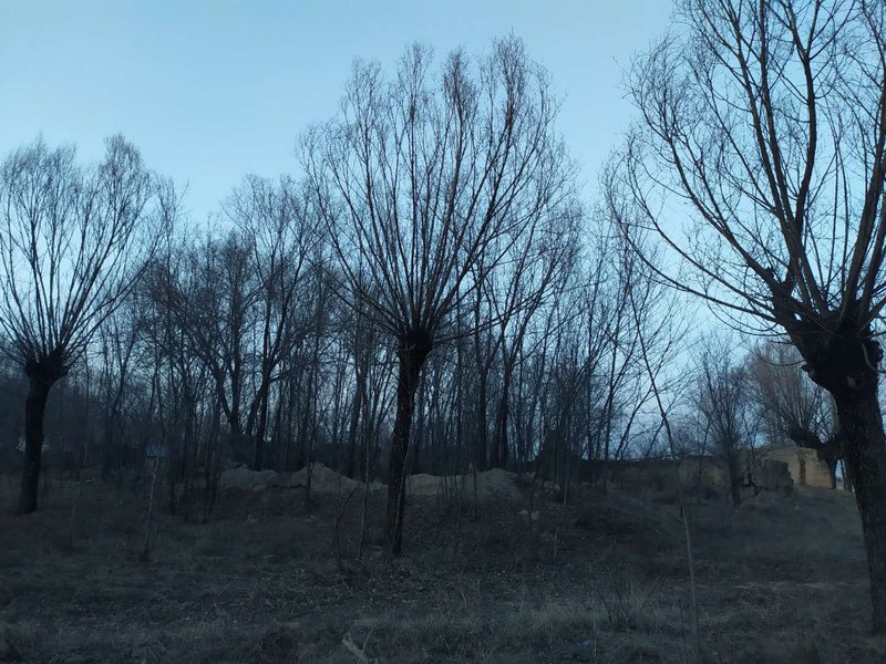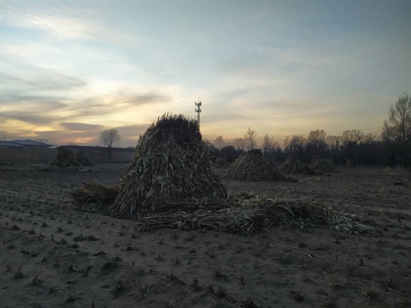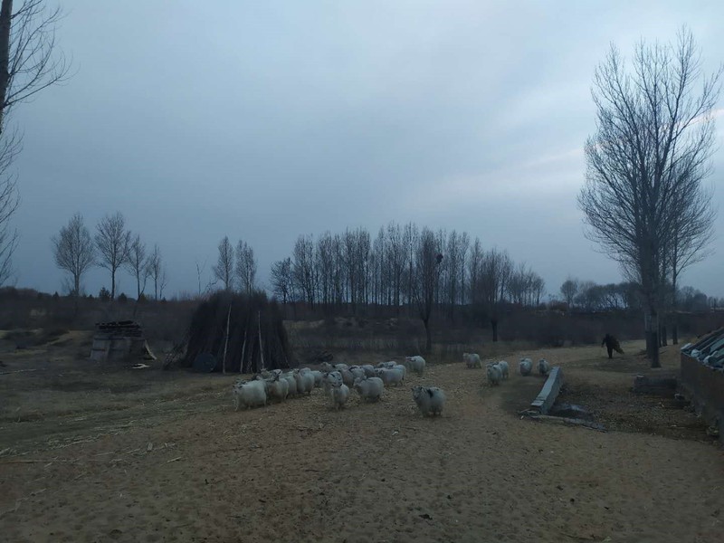 沿着窄窄的田埂前行,远处是一条通向村外的公路,中间开出几个岔口,连向农户的家里。前几年,队里的人一起修路、一起栽树,村里的路网开始改换面貌,却依旧是以泥土路为主,夏天雨后偶尔可见坑洼泥泞。那时,小路两旁刚栽上的松树被一个用柳梢编织的围子围起来,为防谁家的羊偷吃,现已长大。由于村里的田离住户很近,每户人家会在自己房前的路和村里的小路之间建一个栅栏,在划界定分止争的同时也形成一方安全的小天地,里边可以放牧而不怕羊跑到地里去又吃了谁家的玉米或菜,从而引起不必要的纷争。在自家围起来的地方,也可以开垦一片菜园子,里边种西瓜、香瓜、西红柿、豆角等作物,既省去了成熟采摘时的距离,也可以实时观测其生长动态,第一时间享用。冬天,菜圃里没有蔬菜,这里就被当成扎草垛的地方,玉米秸秆从地里拉回来以后,就在这里扎堆,成为羊群冬天的主要食物。
