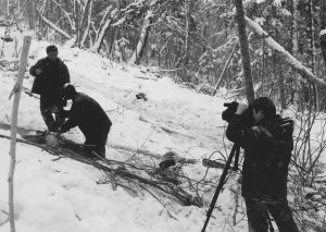 导演于广义(右一)在东北林区拍摄纪录片(朱靖江供图)