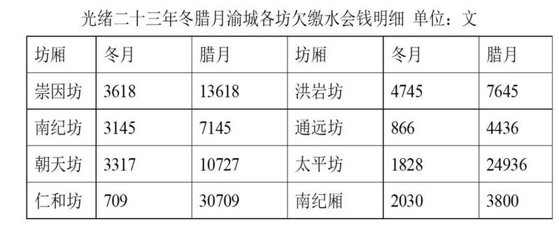 水会公所成立后,照章挨户收取水捐。光绪二十三年二月,国璋在给城内各坊厢保正的“谕”中说,“团里正、监正及各街长等知悉,照得现办水会,饬令各街长按照章程,挨户清查、分别第,逐一填注街口单内,限日收缴钱文”由于此次水捐的抽收标准远高于光绪九年国璋二任巴县知县时所制定的标准,“上等行店月出钱三百文”,普通居民住户也要缴八十文。普通铺户对此较为抵触,不愿意缴纳,以致于川东道强势要求各户三日内必须交齐房捐钱。光绪二十三年三月,渝城治平坊保正陈兴发向县令报称,该坊住户赖天成每月应出水会钱八十文,但赖“不惟不出,反吼骂街邻”,县令批示说“赖天成应给水会钱文,何得抗不付出,殊属非是。着抄批饬令即行付给,毋得违抗”。类似的记载比比皆是。各坊厢保正也反映收款困难,欠款较多。光绪二十四年(1898)初,保甲局局绅刘、吴二人给巴县的移文称,“窃照渝城水会,自去岁创办,行将一年,敝局按月收存……而各坊监保纷纷藉口收取维艰,仍然观望。” 希望巴县县令也下发催缴告示“无论公馆、铺户住家均应一体缴纳水会钱文”。下表是光绪二十三年冬腊月各坊厢欠款明细。