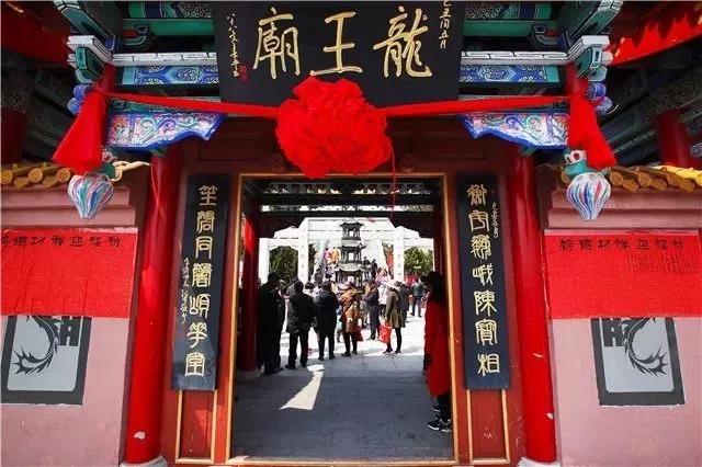 在龙王庙庙墙外面,刻录着历代皇帝御笔题写的众多“龙”字。进得龙王庙内,一道石牌坊映入眼帘,以大字书写“龙王庙”三字,其中的繁体“龙”字分外显眼。龙王庙共有三个大殿,殿前各有一尊香炉,供香客烧香。进入庙门后,左右两边是海神殿和财神殿,中间有一尊2米多高的香炉。石牌坊后是一道十几米高的石梯,显得威严而神圣,拾阶而上便是题名“龙王宝殿”的正殿。龙王宝殿地势较高,殿内立有一尊高大的黄海龙王像,凝视着前方辽阔的海平面。龙王像右侧的塑像是风伯、雨师,左侧则是雷公、电母。各神像上方都悬挂着金黄的丝缎流苏,上面绣有飞龙图案。龙王宝殿的左边是重修龙王庙后所立的功德碑,刻有捐资人姓名,右边立着一道绘有八仙过海图的影壁墙。影壁墙前砌有一座高台,节日期间可作为文艺表演的舞台。
