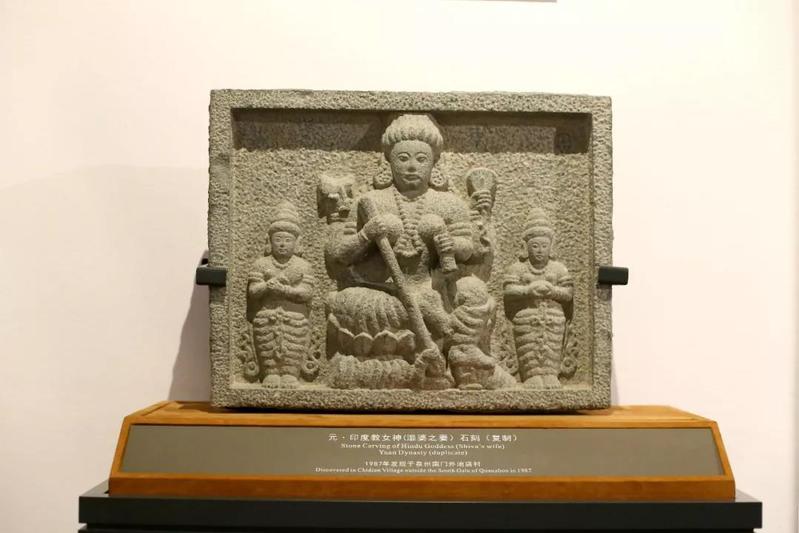 这方石刻是复制品,原件位于泉州晋江池店村兴济亭,其上的女神被当地村民当成观音祭拜。这方石刻1987年被考古人员发现时,受村民祭拜已久。