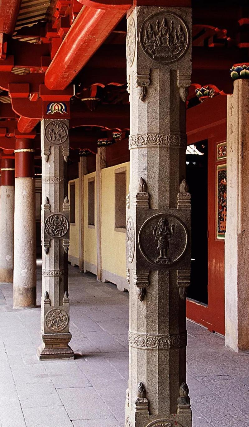 印度教的十六角柱原件位于开元寺大雄宝殿后廊,是元代印度教寺的遗物,明代开元寺重修时移入。石柱上雕刻有与毗湿奴相关的神话故事,如毗湿奴化身为人狮,毗湿奴与坐骑金翅鸟,毗湿奴解救象王等。最有趣的是毗湿奴化身克利希那,既有顽皮的童子形象,也有悠闲地吹着长笛的画面,还有克利希那逗趣牧女的雕刻。克利希那是印度教最富有人性的神,深受信徒的崇拜和喜爱。