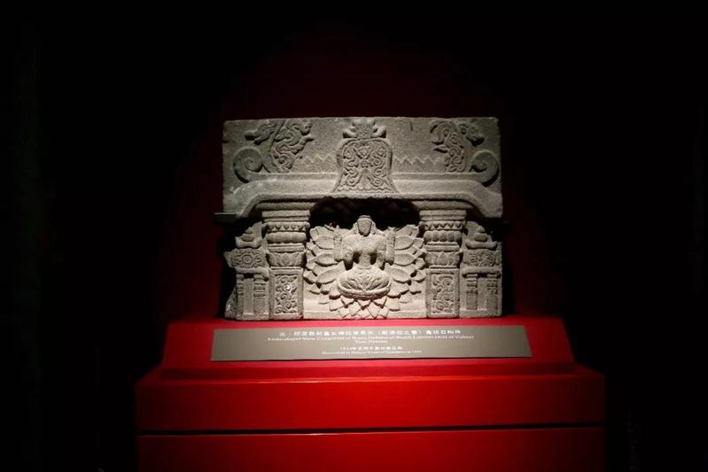 石龛中雕刻的四臂神像是毗湿奴之妻拉克希米,亦称吉祥天女,是印度教中象征财富和繁荣的女神。女神袒露着上体,丰胸细腰,下身着裙子,趺(fū)坐于怒放的莲花中。莲花是拉克希米的重要象征。她左上手持环状神器,右上手持矛状神器,右下手作无畏手印,左手残断。