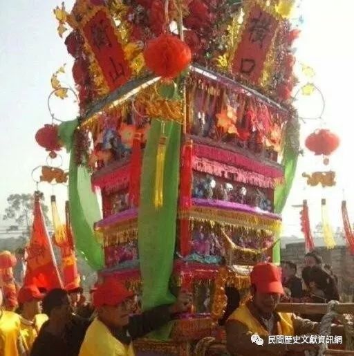 官浔(陈姓):一面锣,一顶精致的三层金黄色大伞盖,4人抬的开漳圣王像。