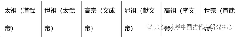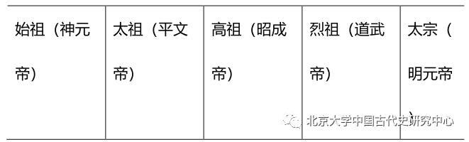 后魏道武帝天兴元年十二月,临天文殿,司徒进玺绶,追尊成帝已下及后号谥,乐用《皇始》之舞,以神元皇帝为始祖,平文皇帝为太祖,昭成皇帝为高祖,考为献明皇帝。