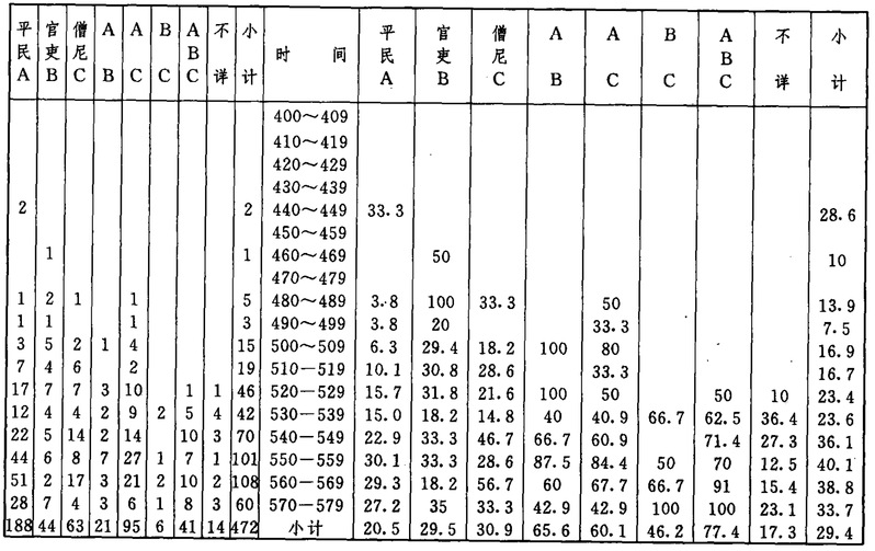 据表的左栏,关心朝廷、皇帝的民众自5世纪40年代,即北魏初年便已出现,但尚不多见,至6世纪,即北魏宣武帝朝以后,认同朝廷者渐多,所占比例亦达15%以上,北魏末,即6世纪20年代增至23%以上,20年后,即东、西魏时期至北朝末则达30%~40%,心系皇家的民众更多。大体上,北朝时期民众对朝廷的关心认同程度与日俱增。具体到不同背景的造像者,平民中存在这种趋势,官吏、僧尼中则无。不同背景的造像者相较,官吏、僧尼比起平民来更关心皇帝的命运。多种身份造像者共同造像时关注国运者更多,这种情况下民众多以邑义、法义形式来组织,换言之,合邑造像时为国祈福者众,这印证了佐藤智水的结论。