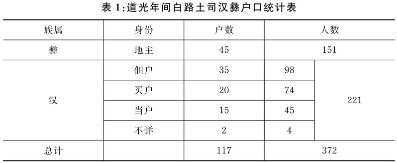 综上可知,随着乾隆晚期开垦火山的流民的逐步到来,冕宁土司地区的汉人数量呈现出增长的趋势。嘉庆年间,因川陕白莲教起义的影响,这一增长趋势进一步扩大,“宁远府属夷地,多募汉人充佃。自教匪之乱,川民避入者增至数十万人,争端渐起”(赵尔巽,1977:11457)。此处的“宁远府”设于清雍正六年(1728),下辖冕宁、西昌等州县。“夷地”即指宁远府所属州县的土司地区。可知,继乾隆晚期之后的嘉庆年间,又有大量移民进入冕宁等州县土司地区。这进一步引起了当地聚落形态的演变,“有汉、夷公居一处者,有汉、夷间杂零星散处者,有汉民自成村落者”(中国第一历史档案馆,2000:826)。可见,土司地区先前“夷多汉少”的局面被打破;新形成的汉族聚落、汉彝杂居聚落对土司村寨形成包围之势;汉彝间的界限亦因此变得日益模糊。白鹿营所属的白路土司地区的情况也是如此,其道光年间的一份残缺户口册(《民族问题五种丛书》四川省编辑组:325—328)对这一变化有所体现,详情如表1所示。