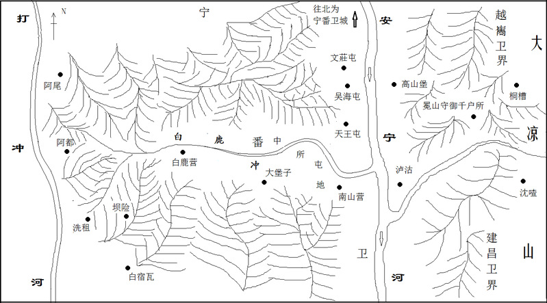 白鹿营所在的四川冕宁县位于大渡河南岸。发源于该县北部的安宁河向南流经今西昌、德昌、会理、盐源等县市,最后注入金沙江。历史上,安宁河一线,东有大凉山罗罗(彝族),西有雅砻江番部(藏族),是沟通川滇、控扼番罗的战略要地(刘应李,2003:461)。因此,明朝初年沿着安宁河流域自北向南设有越巂(今越西县)、宁番(今冕宁县)、建昌(今西昌市)、建昌前(今西昌市)、会川(今会理县)、盐井(今盐源县)六卫及八守御千户所,屯军五万八千名,以保障川滇要道的畅通(黄廷桂,1986:61)。此外,明朝又在卫所体系下设建昌、德昌、威龙、普济等土官辅助统治(李贤,1986:556)。
