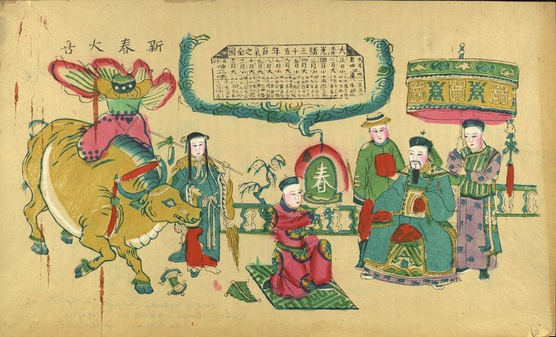 除了單純的春牛圖年畫,也有介於農民曆及年畫之間的曆畫,在春牛圖之外,還搭配了當年度的簡單年曆,其中最明顯的就是24節氣對應到的陰曆日期。