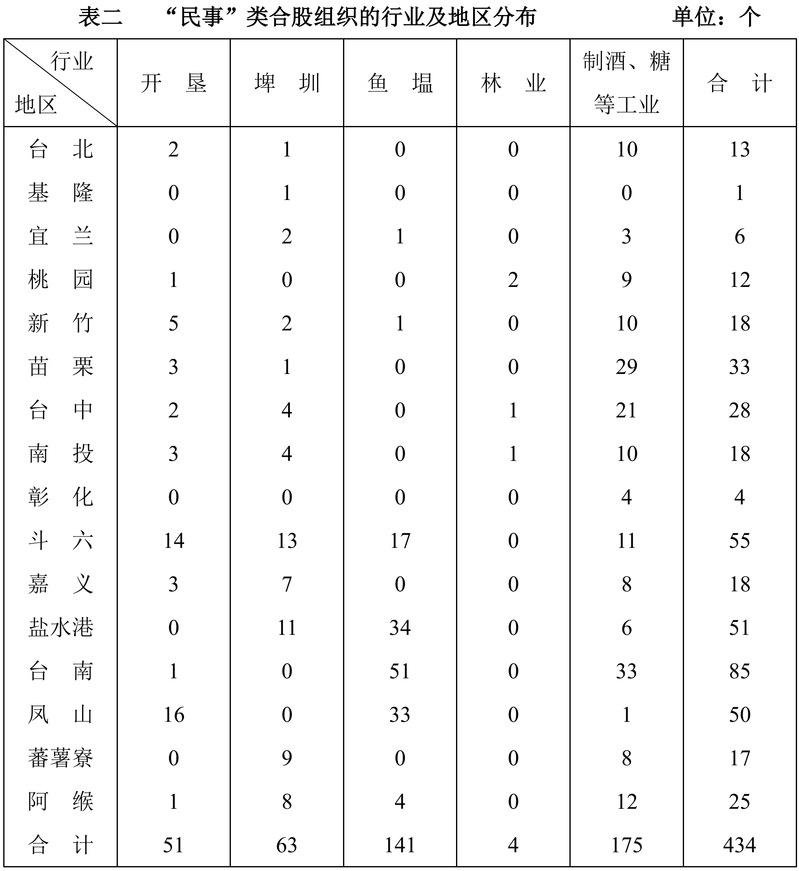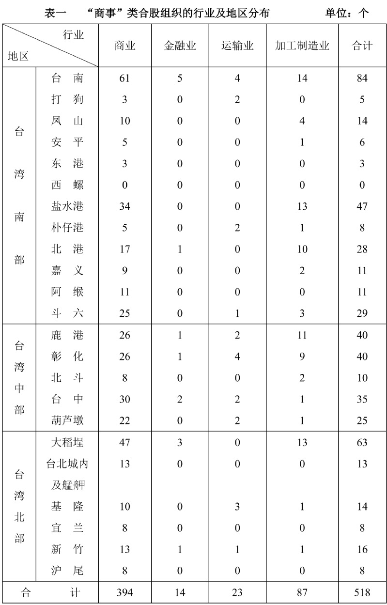 上述二表的数据,主要取自于日据初期的调查资料,可能尚不足以反映清代台湾合股经营的历史全貌。不过,其中大多数的合股组织,已经存续数十年乃至上百年,因而仍可反映其基本的发展态势。此外,上述二表的统计项目,也不是很周全的。例如,当时台湾有428个渔业团体,其“合股”资本达129,916元,而调查者则视之为“同业组合”,未列为统计项目。又如,清代台湾有许多乡族组织经营的共有经济,实际上也是合股经营的表现形式之一,而在此亦未作统计。限于篇幅,本文不拟详述清代台湾合股经营的各种不同形态,但应当指出,在中国传统社会中,合股经营是一种相当普遍的社会经济现象,在东南沿海及台湾地区尤为盛行,因而是不可忽视的民间经济组织。