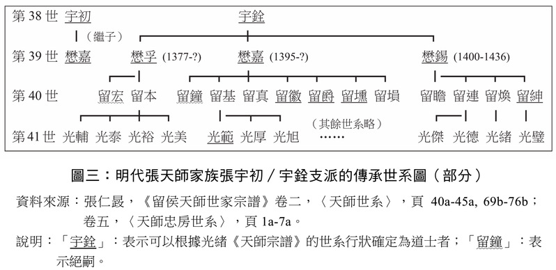 從光緒《天師宗譜》所載世系行狀等資料來看,張宇初/宇銓支派的入道成員至少有9位。這其中包括張宇銓及其長子張懋孚(1377-?)、次子張懋嘉(過繼張宇初)、幼子張懋錫(1400-1436),以及張懋嘉的第四子張留徽(1428-1478)、第五子張留爵(1430-1482)、第六子張留壎(1436-?)、嫡長孫張光範和張懋錫的幼子張留紳。(參見圖三)一旦喪失符籙專賣權,張宇初/宇銓支派的利益將受到極大的損害。在天師位爭奪中取勝的張元吉,顯然對此十分瞭解。為了對張宇初/宇銓支派施加報復,他才兩度向皇帝請求頒佈敕書,禁止其「私出符籙」。與此同時,張元吉也利用其作為正一道首領、掌管天下道教者的身分,剝奪了張宇初/宇銓支派的入道權。自從與張元吉同代且與其子嗣張玄慶爭奪天師位的張光範入道後,張宇初/宇銓支派再也沒有出過道士。