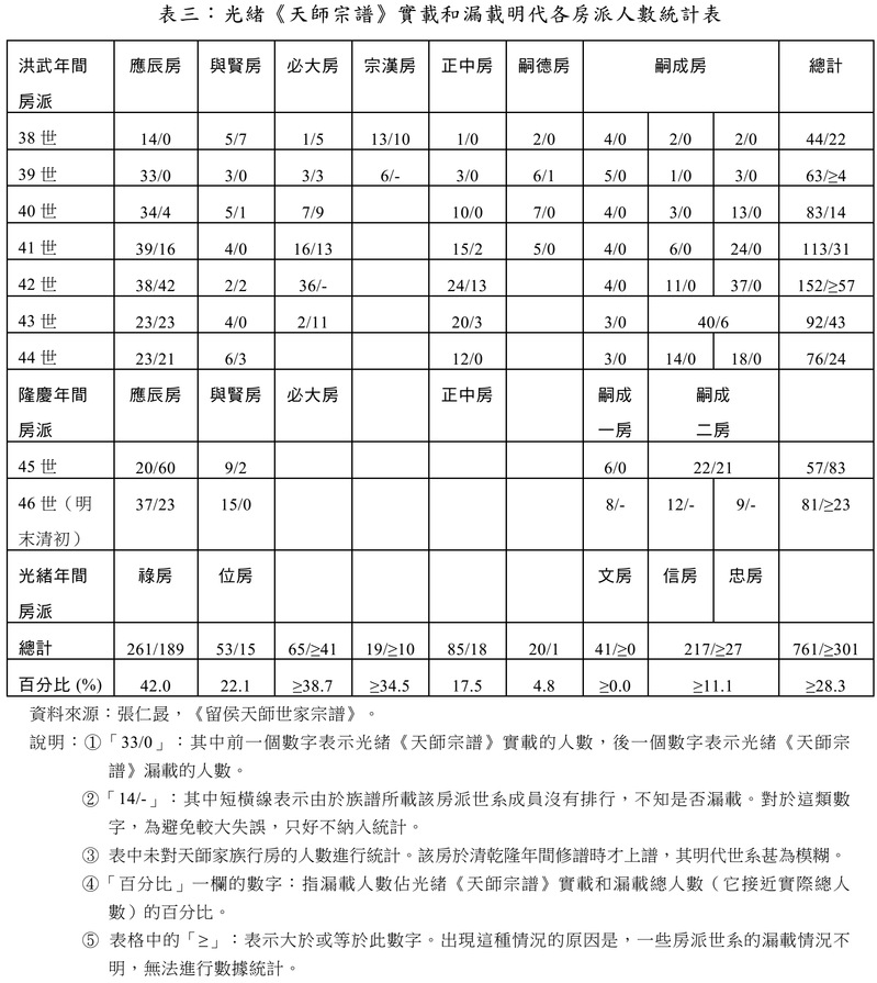 在天師家族各房派中,嗣德房和嗣成二房譜系漏載的人數比例最低。從第三十八到四十一世,嗣德房譜系僅漏載1人,佔該房總人數(21人)的4.8%。但這並不等於說該房譜系堪稱完整,因為嗣德房譜系於第四十二世斷裂。這已不是單純的漏載,而是整世缺載。明代嗣成二房譜系至少漏載27人,佔該房總人數(244人)的11.1%。明代嗣成二房譜系的漏載人數,全部集中在第四十三、四十五世。嗣成二房第四十三世譜系漏載6人,第四十五世漏載21人,後者與譜系實載人數(22人)相當。嗣成二房譜系成員漏載集中在這兩世,與當時嗣成二房大部分成員的外遷有關。如前所述,明正統、成化年間發生了兩次天師位爭奪,失敗的嗣成二房(主要包括張宇初/宇銓支派、張正肅支派)成員處境艱難,被迫大量外遷。待隆慶或乾隆年間修譜時,已難以對嗣成二房很多成員的世系進行考證。這才造成嗣成二房譜系在這兩世漏載甚多。無論是嗣成二房、嗣德房,還是應辰房、必大房、宗漢房、與賢房、正中房,他們都屬於天師家族中非天師位傳承的房派。明代天師位傳承的房派——嗣成一房(主要包括張宇清支派),則基本未被漏載,其成員都被完整地記錄在族譜中。可見,明代天師家族中被族譜漏載的成員,全部集中在非天師位傳承的房派,天師位傳承的房派譜系則頗為完整。