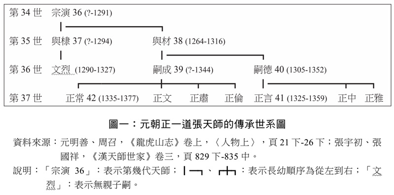 明初的正一道張天師繼承制度,直接承自元朝而來。在討論明朝的天師繼承制度及其轉變以前,有必要先明瞭元朝的天師繼承制度。以下是元朝三十六代至四十二代天師的傳承世系圖: