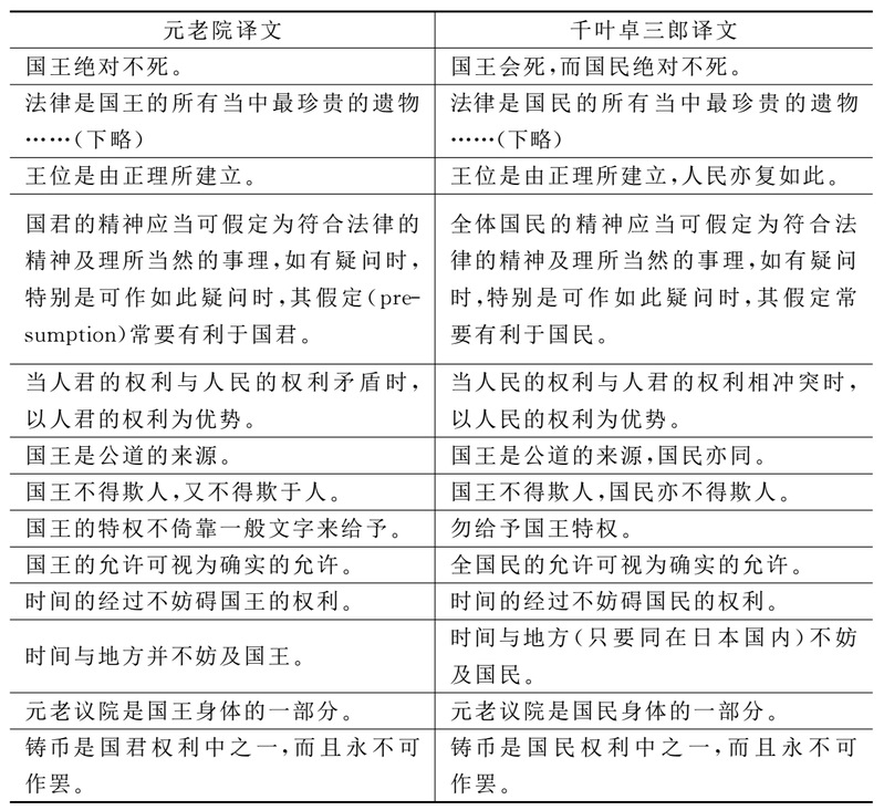 当然,我们还要发掘各阶层的思想材料。在我研读日本明治时期的思想史时,我注意到色川大吉的《明治の文化》中所提到的一件颇为引人注意的事件。1968年,色川大吉在明治时期的武藏国多摩郡、一个只有二十几户人家的深沢村里,从一户人家的仓库中,发现了《五日市宪法草案》。这个草案有204条,是五日市学艺讲谈会的30名会员在自由民权运动期间持续讨论,再由山村中小学的助教员千叶卓三郎起草的一部草根宪法,时间大约是明治十四至十五年(1881—1882)。这个山村中的小圈子是以深沢名生(1841—1892)及其子深沢权八(1861—1890)为中心,在他们周围的是一群村中名士、校长、神官、僧侣、医生、地主、农村青年。色川大吉发表这个消息之后,他发现事实上当时存在30余种民间的宪法草案,其中嘤鸣社的草案比《五日市宪法草案》的条文还多四倍。而且这一类文稿相当多样,譬如千叶卓三郎对Henry Peter Brougham(1778—1868)《法律格言》(Institutional Maxims)的诠释,与元老院对《法律格言》的翻译便截然不同: