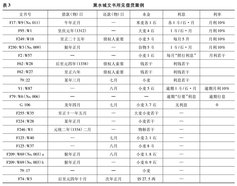 (3)最后9件文书未提及利息(或者由于文书残缺,利息不明)。这些没有提及利息的文书当中,应该至少有一部分与第(2)组文书类似,在规定的借贷期内是无息的。这类无息(或借贷期内无息)借贷在黑水城社会中究竟具有怎样的意义,还有待进一步研究。