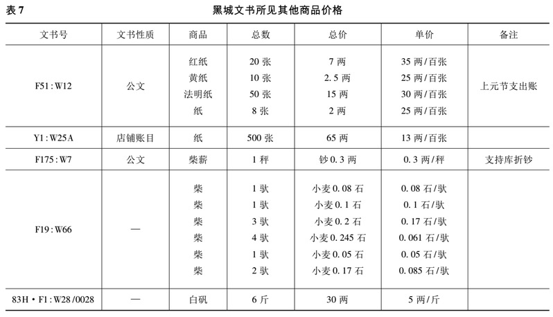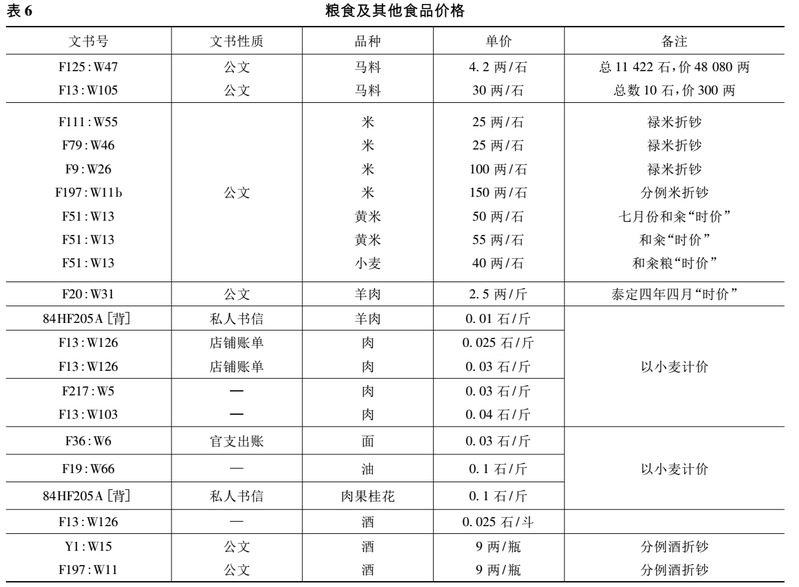 表6是黑城文书中所见的粮食、肉类及其他食品价格。