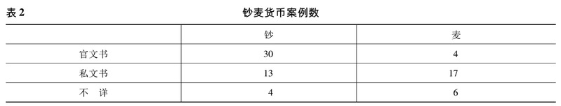 虽然都是货币,但钞和小麦在当地经济中的角色并不一样。表2统计了本文所用不同性质文书中两种货币出现的案例数。