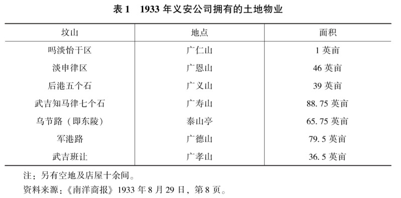 義安公司是1845年佘有進和12姓潮州籍華人建立的團體,「宗旨在酬神及聯絡鄉僑感情,並增購墳山,以供同僑埋骨之所。」義安公司原來是佘家族掌控、澄海海陽兩縣潮州人設立、服務旅新潮人的宗教慈善團體。1928年在新加坡的潮籍人士不滿佘氏操控公司,成立「潮州公產維持會」,組織「潮州八邑會館」,并且通過法律訴訟,在1930年重組義安公司,并于1933年在立法議會通過新公司的章程和宗旨。新公司的五條宗旨中,有三條與宗教信仰和儀式習慣,其中第三條「本公司對所有各墓地及其他產業,皆負有維持管理及改良之責,遇必要時得擴大發展之,其無需用爲墓地者得自由發展,以爲建築或其他事業之用。」據1933年8月9日《南洋商報》的報導,義安公司經政府特許注冊,有包括七個墳山在内約400英畝公地。(見表一)潮人最早的墳山爲位于東陵烏節路的泰山亭。泰山亭除了墳墓外,有泰山廟一座,并且有各姓氏的會館和公冢。義安公司很早就察覺墳地的經濟價值。在1935年開始填平一部分山地,預留作爲建築之用。據1936年的報導,泰山亭有園地出租爲種植花卉之用。