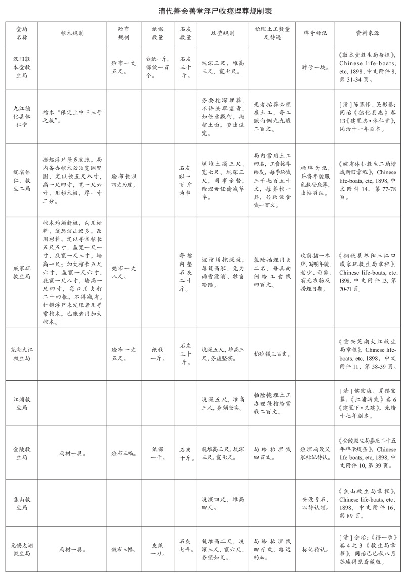 尸体处理因话题较沉重,史学界关注较少。近年来随着善会善堂史、红船救生史研究的兴起,尸体处理方面逐步受到关注,如王卫平、张文、夫马进、吴琦、黄永昌、周秋光等人对历史时期尸骸处理收瘗有所探讨,但这些研究主要着眼点在于对尸体的义葬、助葬等慈善活动,虽对尸体处理有所涉及,却并不深入。我们以前对浮尸处理有一定关注,研究的关注点主要在救生而非浮尸收瘗,山本进则主要对清代浮尸收瘗中应对政府衙役的敲诈勒索进行了探讨,黄永昌、周秋光等则是对浮尸收瘗一笔带过。总的来看,已有的研究对清代浮尸收瘗中的人文关怀探讨并不系统,所以,从学术上来看,很有必要加强研究,同时在动辄“挟尸要价”的当下,深入研究清代浮尸收瘗中对逝者、生者不同的人文关怀也有着重要的现实意义。