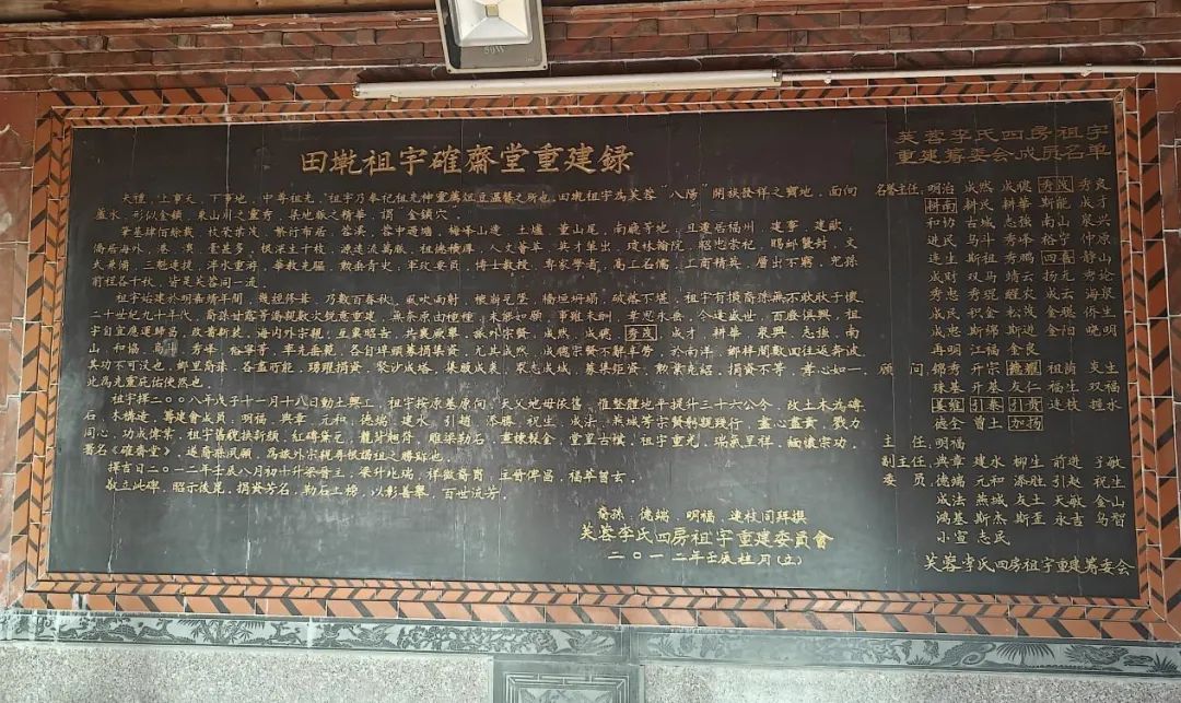 蓉溪村最重要的祖厝称为确斋堂,也就是“田墘大厝”,是芙蓉李氏六世祖四房的大祖厝。据族谱记载,确斋堂修建于先贤选定的风水宝地“金锁穴”,初建于明朝嘉靖年间。经历数百年历史,祖厝已经破败不堪、厅堂倒塌。因此,四房宗亲于2010年开始重修确斋堂,并于2011年竣工。新修建的确斋堂一改曾经破败的样貌,变得恢宏大气、厅堂整洁、管理有序。对于蓉溪村的村民来说,确斋堂是纪念他们共同祖先的祖厝。因此,确斋堂的管理除了有相应的委员会负责,村委会和老人会也会起到统筹组织的作用。