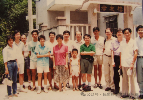 「華南地域社會和國家意識形態比較研究」計畫之潮蓮會議。前排左起:蕭鳳霞、村書記某及其子、蔡志祥。後排左起:村幹部某、杜榮佳、黃永豪、劉志偉、陳支平、鄭力民、陳其南、鄭振滿、科大衛、彭律師、葉顯恩、羅一星。(1990)