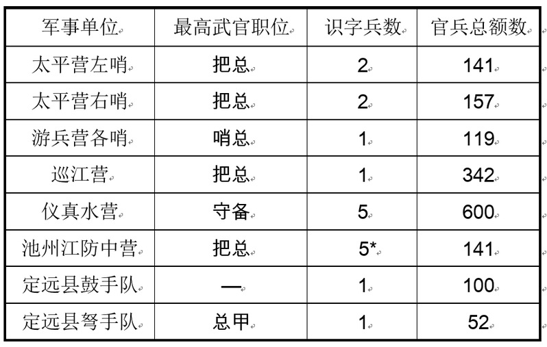 表2中各营识字兵的编制大致也以把总为界,一般把总下的识字兵在1至2名,把总以下武职为1名。在稍高一级营官中,因需要管理的士兵数更多,识字兵额有超过2名的情形。这一规定数额,在方志资料中也得到佐证。例如,同治《重修上高县志》兵卫载:“羊坡哨隔城三十里。前明时有哨官一员,哨房一所,共兵一百二十五名。内识字兵一名。”再如,同治《高安县志》记高安营崇祯兵事时云,“常兵三百四十二名,内防守羊脑寨十名,石鼻哨五名,机总四十名,识字兵一名,余二百八十六名”。又如,光绪《靖江县志》云:“天启七年(1627年)增置永定营,哨官一员,识字一名,士兵一百名。”这类基层的地方哨守,识字兵的编制也多为1名。