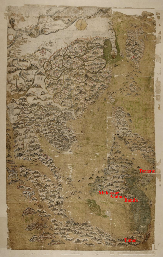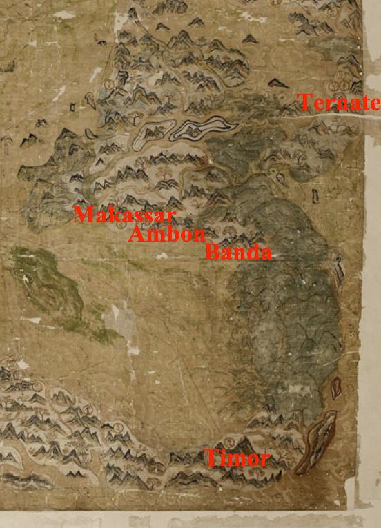 这一变化可以在著名的塞尔登(Selden)地图上得到体现。该地图是英国远征队的指挥官于1609年在班丹(Bantam)所获得。马鲁古群岛位于在这张地图的右下角。初看之下,这张地图错误百出。如果我们放大到马鲁古地区,就会发现特纳特与马鲁古群岛的其他地区分离,并且在一条从北边延伸过来的航路的尽头; 帝汶位于安汶的东部,被认为是在爪哇岛上; 望加锡(Makassar)位于安汶的西北部;班达(Banda)群岛被不成比例的扩大。然而,如果从整张地图来看,该地图其实是一张当时中国最为先进的航海图:在其顶部,有一个罗盘;在海中,存在交叉的航行路线,其转折点上还标示有指南针的方向。由于这张地图,现代早期华人海商的海洋世界被第一次以图像的方式呈现给当代的历史学家。