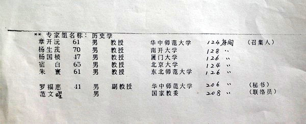 历史学专家组成员5人:华中师范大学章开沅教授(61岁,召集人)、南开大学杨生茂教授(70岁)、厦门大学杨国桢教授(47岁)、北京大学宿白教授(65岁)、东北师范大学朱寰教授(61岁)。