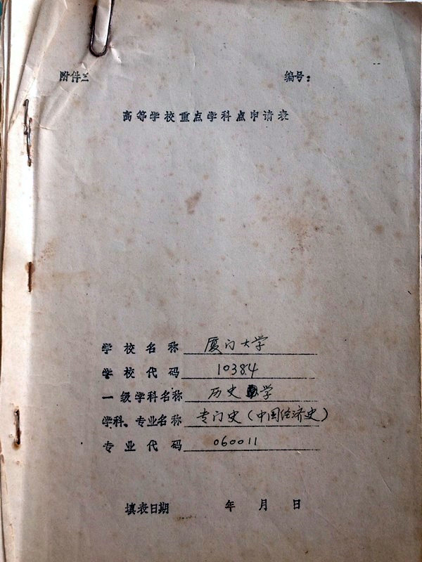 我所在的厦门大学是首批拥有博士学位授予权的高校,经国务院学位委员会三次审批,共有18个博士点、30位博士生导师,在学科建设、研究生培养、学术环境、工作条件等方面都符合申报的条件,于是由1986年试办的研究生院牵头组织相关博士点,搜集资料,填写申请表。我们历史系有中国古代史和专门史(中国经济史)2个博士点,傅衣凌、韩国磐、杨国桢3位博士生导师,经校、系研究,决定2个博士点联合申报专门史(中国经济史)为全国重点学科点,由我负责填表。我至今还保存这份申请表的底稿。