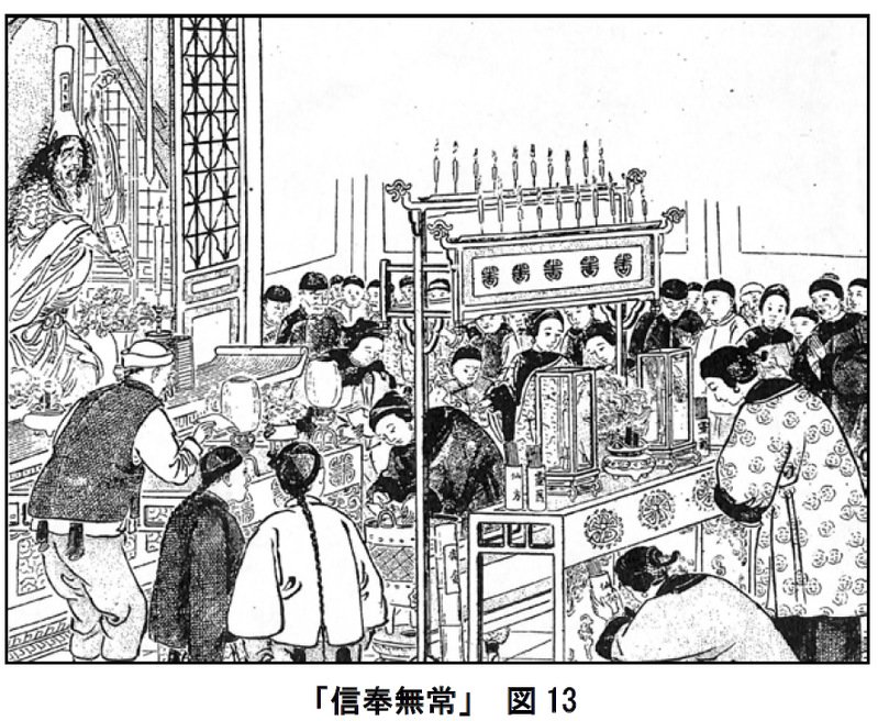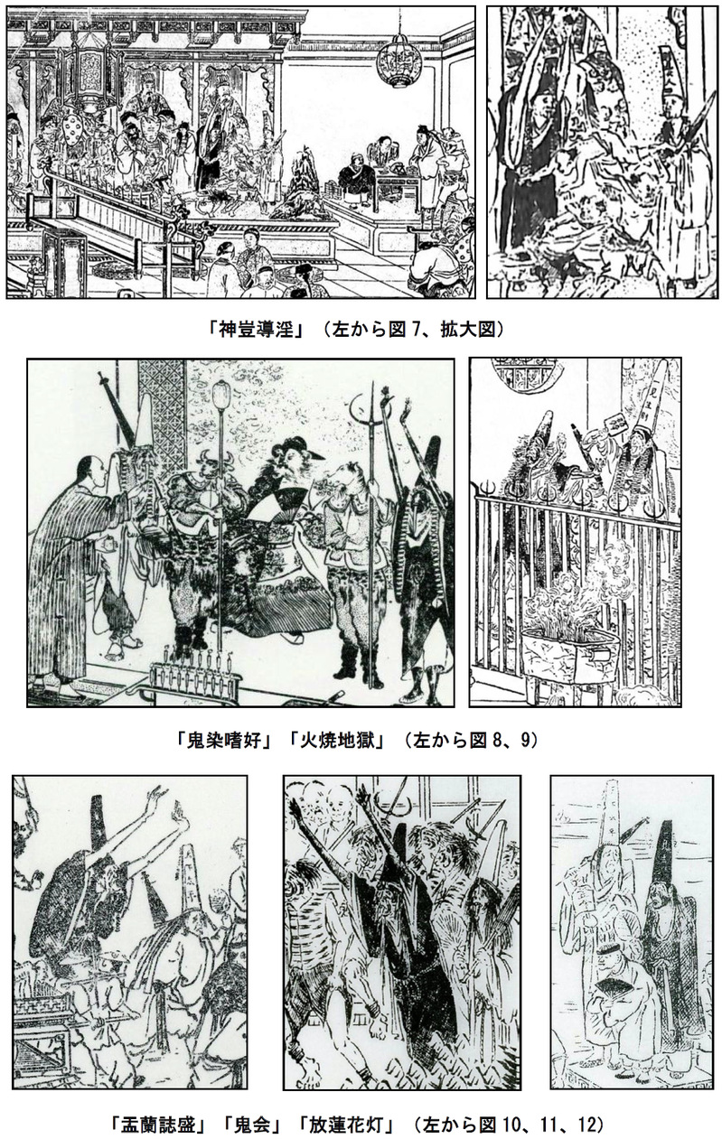 例えば、「神豈導淫(神がどうして淫行を導くだろうか)」(図7)という記事がある。穗垣城隍廟(「穗垣」は広州の別称)の十王殿を描いたという絵の片隅に、傘を手にした白無常と、その隣で諸手を挙げた黒無常の塑像が確認できる。他に[○●]が確認される記事としては、「鬼染嗜好(幽鬼が阿片に手を染める)」(図8)、「火焼地獄(焦熱地獄)」(図9)等があり、各種迎神賽会を報じたものとしては、「盂蘭誌盛(盂蘭盆の盛況)」(図10)、「鬼会(幽鬼の仮装行列)」(図11)、「放蓮花灯(蓮花灯を河に流す)」(図12)等がある(やはり黒無常の諸手を挙げたポーズが散見される。黒無常を溺死者の幽鬼