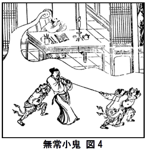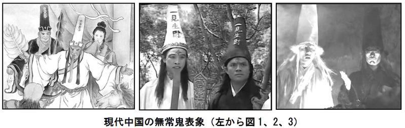 図1、2、3には、蓬髪に、烏帽子のような山高帽を頂き(帽子の上には「一見生財」「天下太平」などの文字が確認できる)、時に口から長い舌を垂らした、白装束と黒装束の人物が見える。いずれも、連環画(中国独自の漫画形式)やTVドラマに確認される、現代中国における無常鬼の表象である(一般に白装束の方を「白無常」、黒装束の方を「黒無常」と呼び、併称する場合は「黒白無常」と呼ぶ)。いくつかの特徴的なパーツで構成されるその造形は固定化され、作品ごとの差異をほとんど感じさせぬものとなっている。