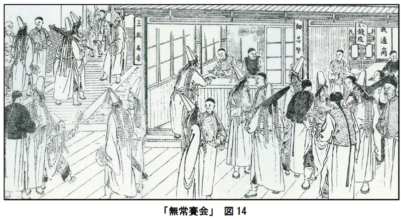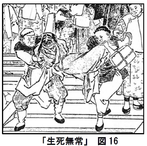 例えば、「生死無常(生死は常ならず)」(図16)という記事がある。寧波に柴橋という市場があり、そこに出入りしていた范という商人が、ある日の帰路にて無常鬼に(その魂ではなく)所持品を掠奪されてしまった話が報じられている。無常鬼の姿については、「古い墓の隣を通ったところ、突如白衣を身に纏い、山の高い帽子を被った者が一人、墓のなかから現れた(行經古塚旁,忽一白衣、高帽者,自塚中出)」と、白装束だったことが明記されてあり、このことは絵にも反映されている(描かれているのは、犯人が罰として河に沈められようとしている場面)。