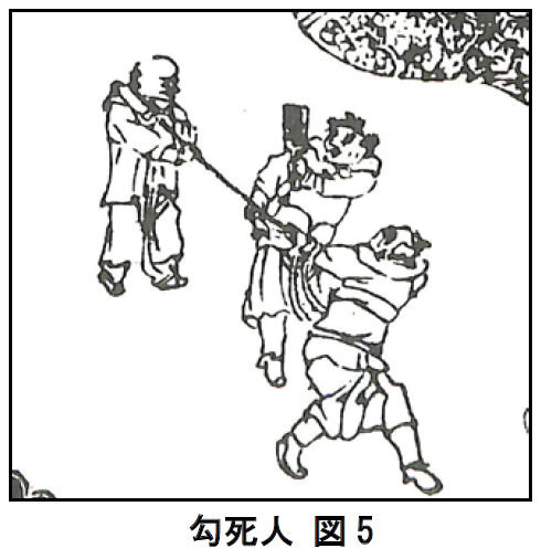 例えば、「無常」という語句が勾魂使者の名称として使用された早期の用例のひとつに、『古今小説』巻三十一「鬧陰司司馬貌断獄」の「閻君得旨,便差無常小鬼,將重湘勾到地府(閻魔はその旨を受け、無常小鬼をつかわし、重湘を地獄に連行させた)」がある。ここに記された「無常小鬼」なる勾魂使者の形象は、その挿絵(図4)に見えるとおり、小さな角を生やした諸肌脱ぎの小鬼(こおに)たち(計3体)であり、いわゆる無常鬼のそれとは大きく異なっているのである。ちなみに、上掲図3はドラマ版『西遊記』の無常鬼表象であるが、少なくとも明刊本『西遊記』に無常鬼の名はなく、あるのは「勾死人」と呼ばれる勾魂使者である。清初の挿絵に描かれたその形象を見ると、やはり今日言うところの無常鬼ではないのであった(図5)。