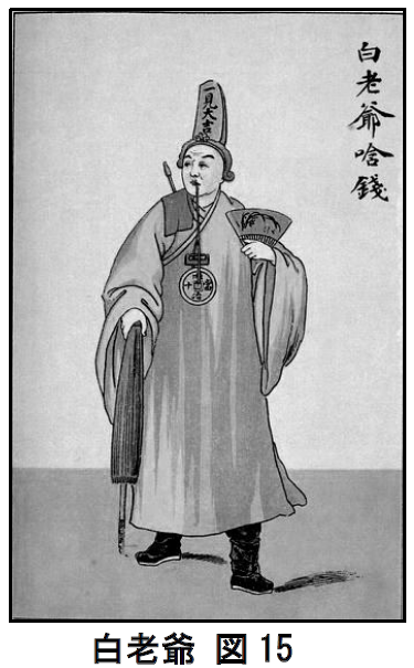 ちなみに、Henri Doréが記録した(白無常と同一の存在と思われる)「白老爺」(図15)(が口に咥えた銅銭)には、魔除けや招福の効果があるとされていたという。このように白無常が一獄卒としての性格を逸脱し、霊験あらたかなご神体として人々の信仰を集める事例は珍しくなかったようである。ただしこのことは、[○]が無常鬼表象における例外であることを、必ずしも意味するわけではないだろう。むしろ筆者は、両記事に確認された「無常鬼=[○]」の図式を重視したうえで、[○]こそが無常鬼表象の本道だったのではないか、とさえ考えるのであるが、おそらくかかる主張は、次項以降の議論にてより明白になるものと思われる。